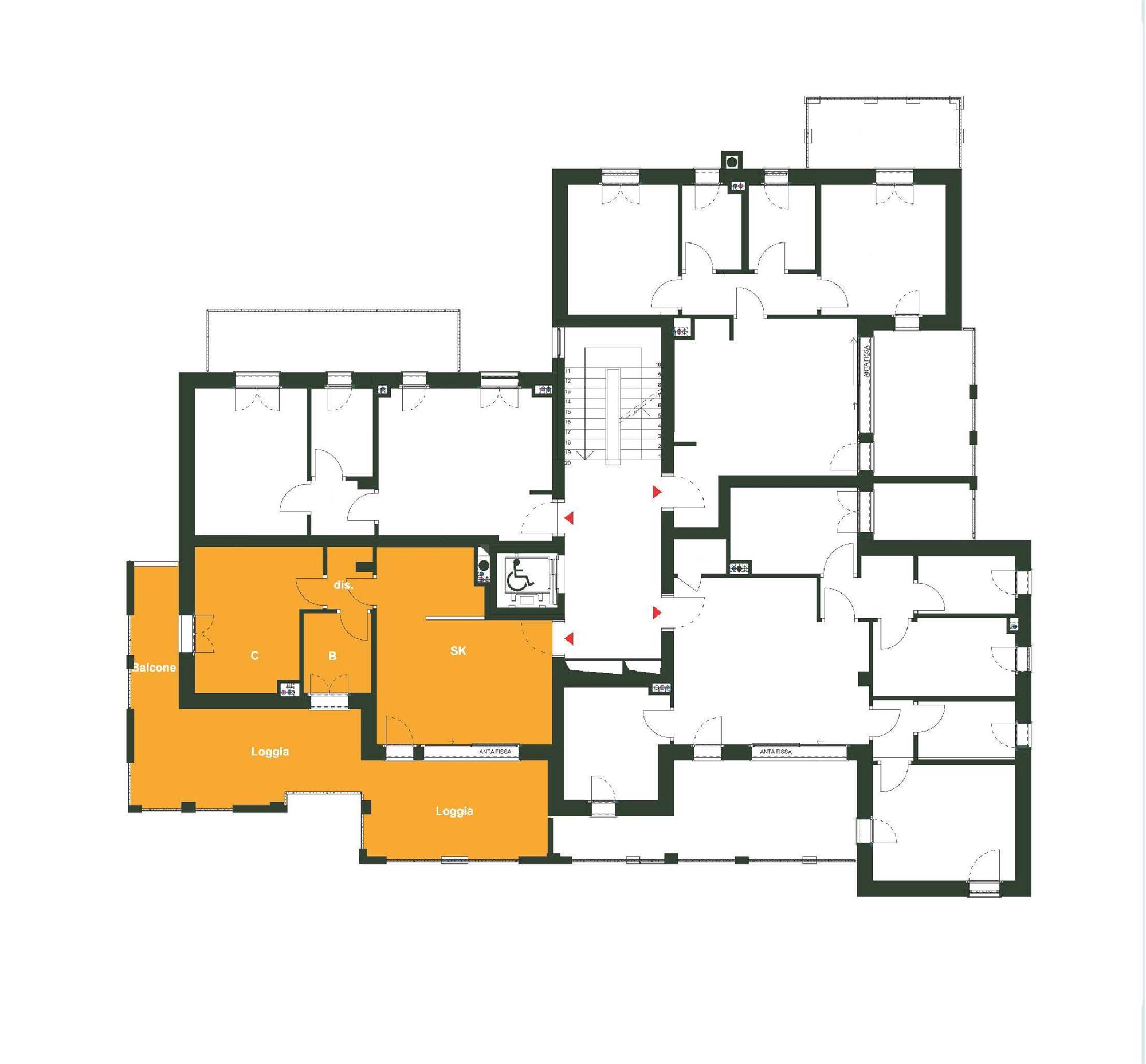 Ingresso, ampio soggiorno con porta finestra affacciata sul loggiato, angolo cottura, disimpegno notte, ripostiglio, bagno, camera matrimoniale. La proprietà è completa di un locale uso cantina di mq.9 al piano S1.