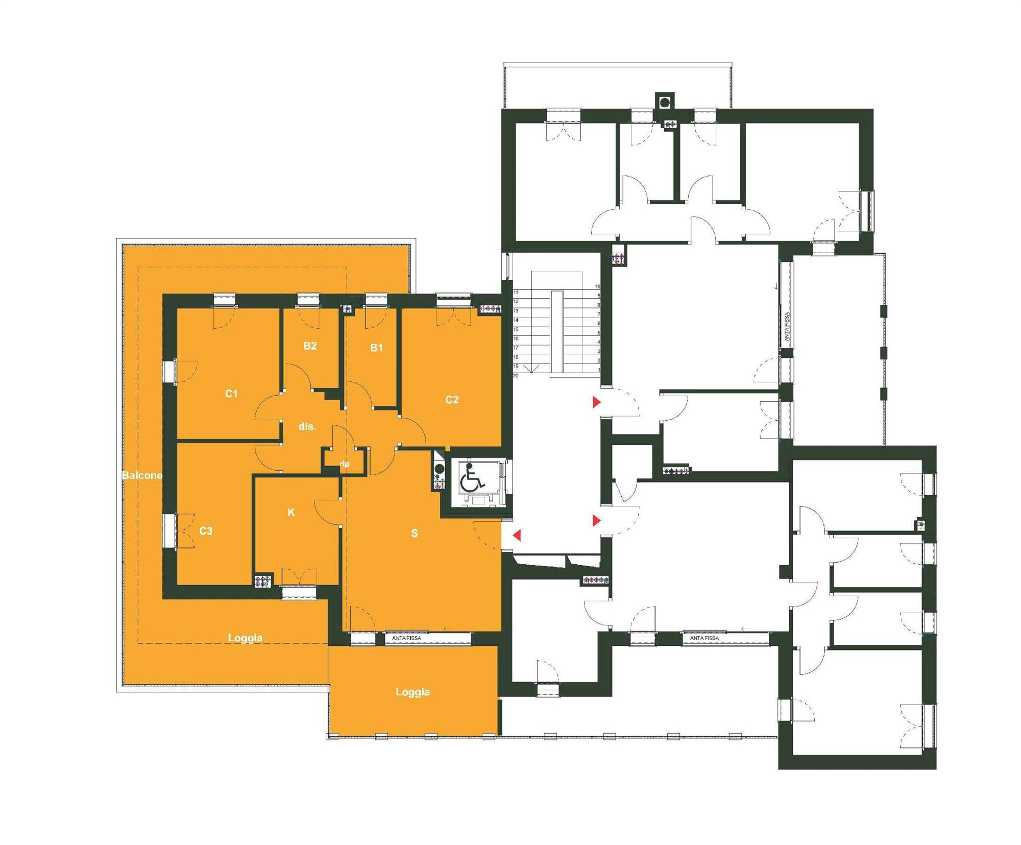 L’appartamento C12, di 4 LOCALI al piano TERZO con terrazzo di mq.32, oltre balcone di mq. 37, con esposizione OVEST/EST/NORD, si compone di: