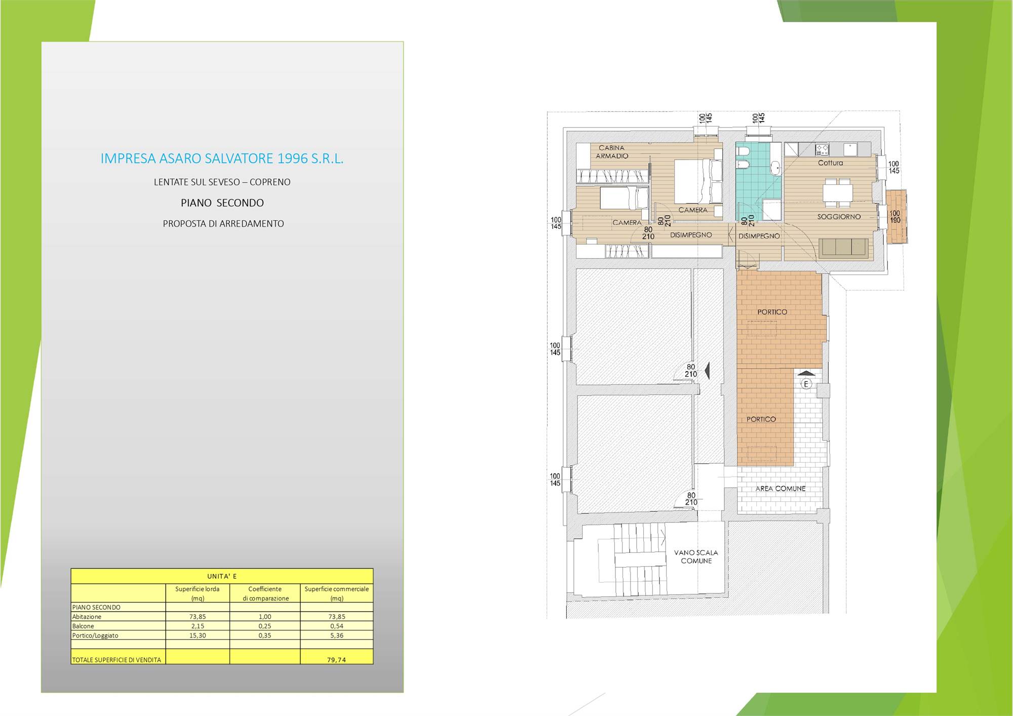 Ingresso, soggiorno, angolo cucina a vista, bagno con doccia, disimpegno, 2 camere da letto, portico esclusivo.