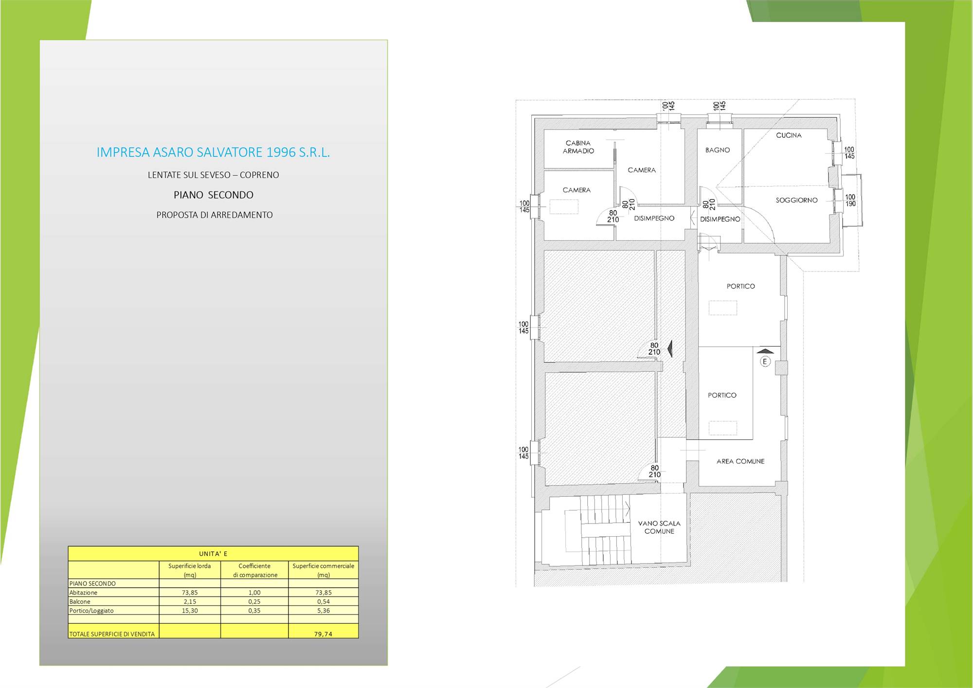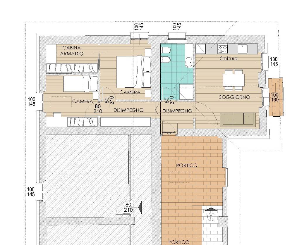 Ingresso, soggiorno, angolo cucina a vista, bagno con doccia, disimpegno, 2 camere da letto, portico esclusivo.