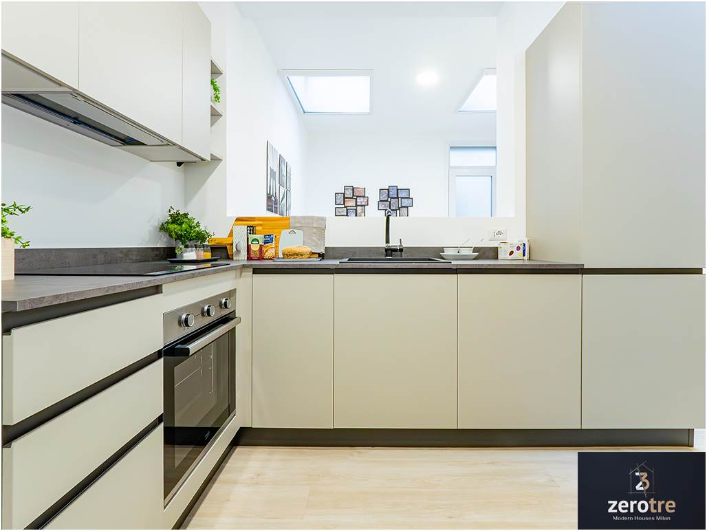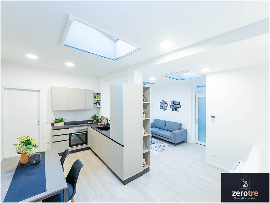 L’ingresso accompagna nella ampia e luminosa zona living con cucina a vista, bagno con doccia walk-in e camera da letto matrimoniale; la scala in muratura conduce al piano inferiore che si compone di due ambienti versatili, un secondo bagno completo con doccia e di una comoda zona funzionale lavanderia/stireria.