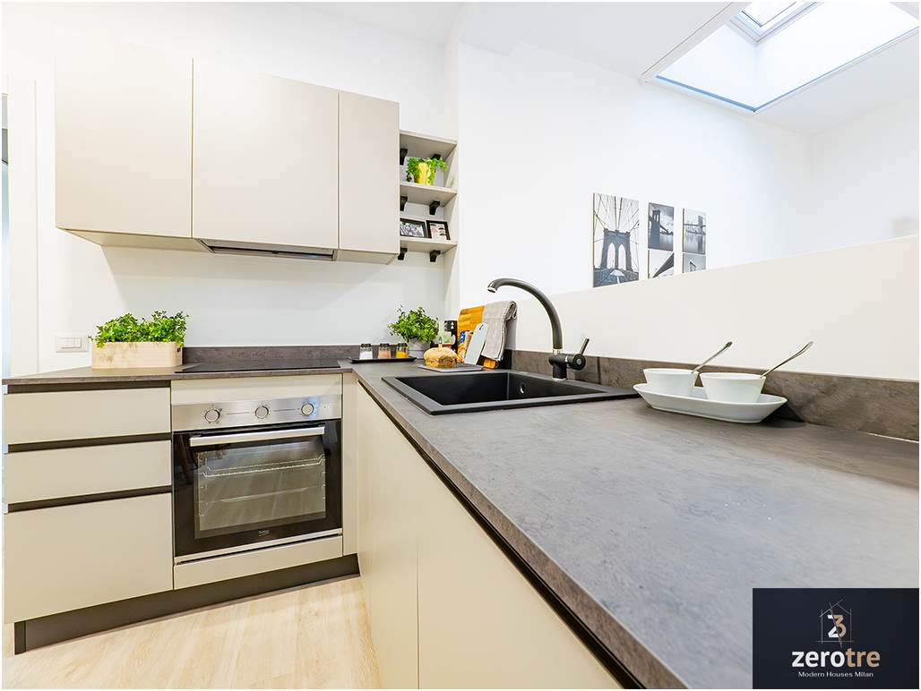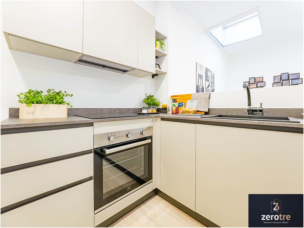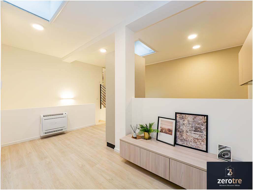 L’ingresso accompagna nella ampia e luminosa zona living con cucina a vista, bagno con doccia walk-in e camera da letto matrimoniale; la scala in muratura conduce al piano inferiore che si compone di due ambienti versatili, un secondo bagno completo con doccia e di una comoda zona funzionale lavanderia/stireria.