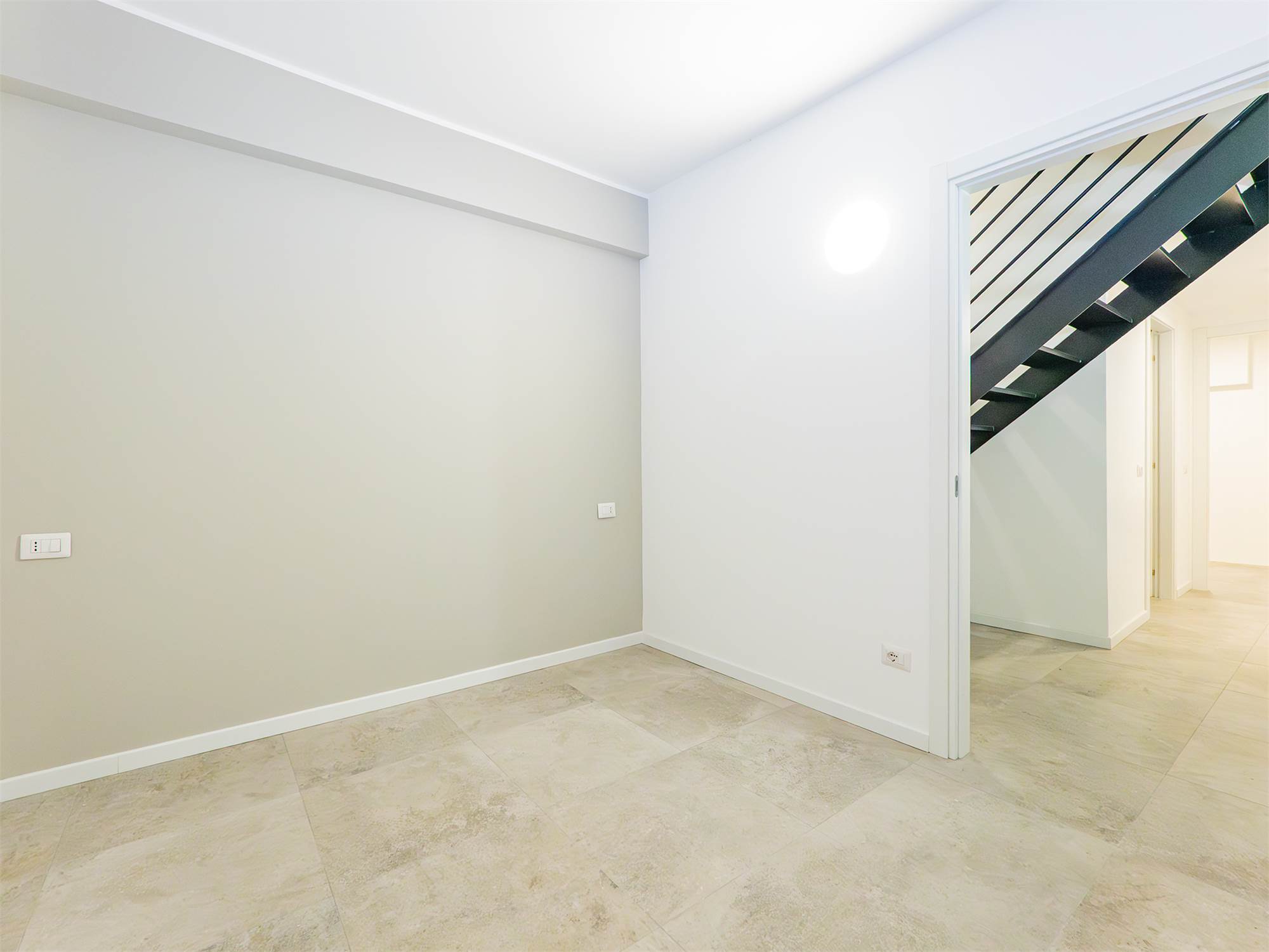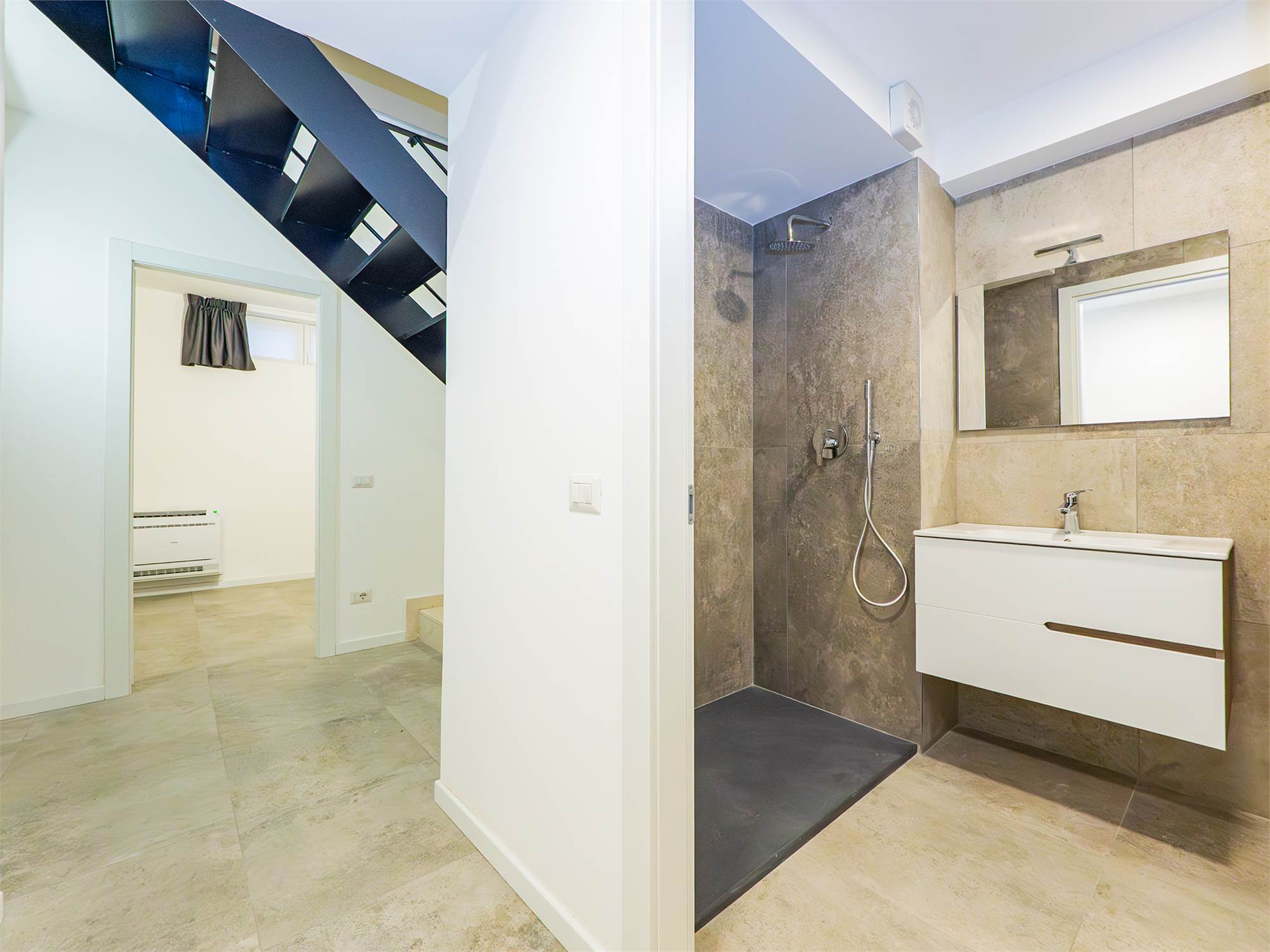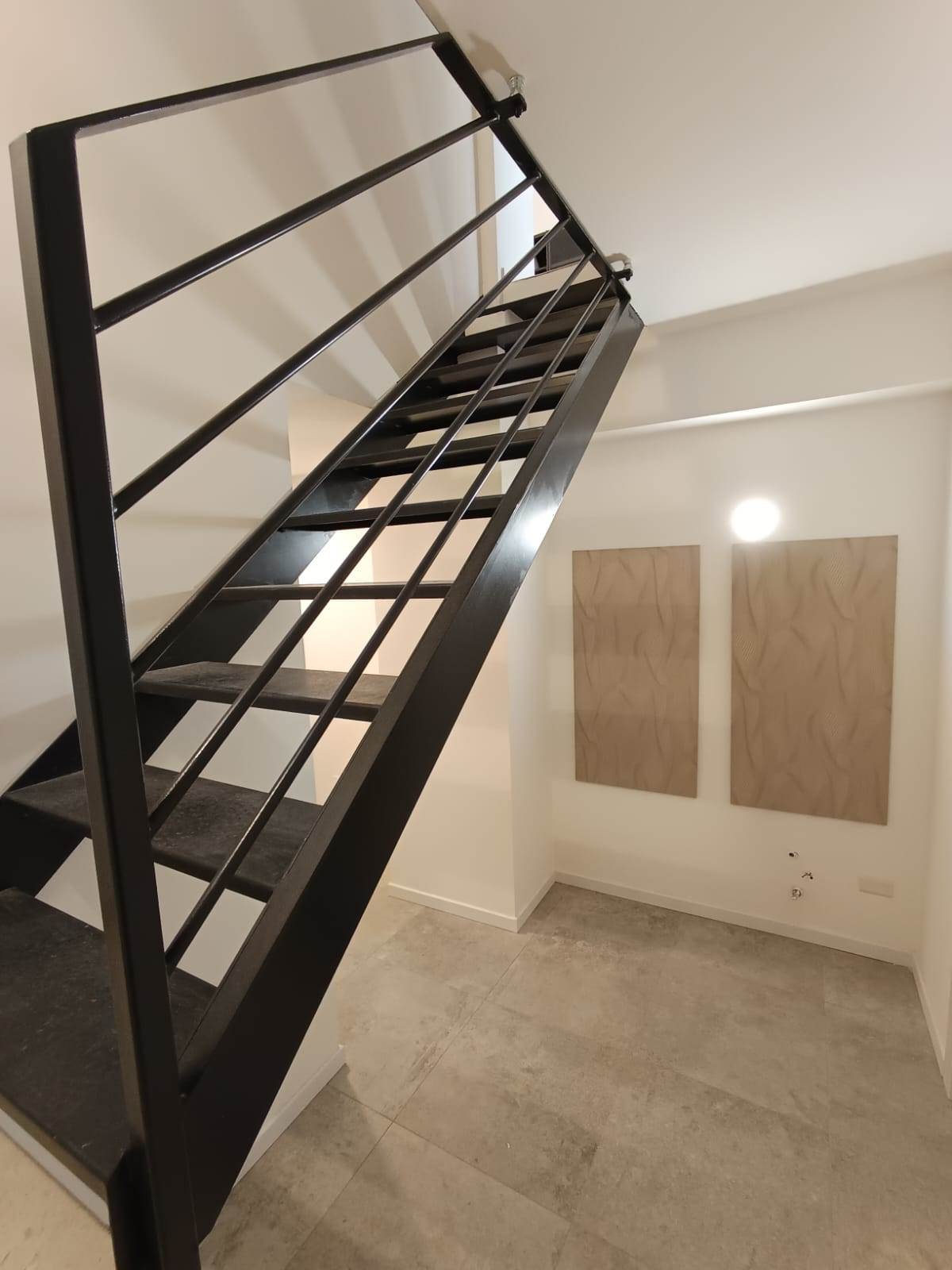 L’ingresso accompagna nella ampia e luminosa zona living con cucina a vista, bagno con doccia walk-in e camera da letto matrimoniale; la scala in ferro e muratura conduce al piano inferiore che si compone di un locale studio versatile con finestra in facciata, un secondo bagno completo con doccia e di una comoda zona funzionale adibita a lavanderia/stireria.