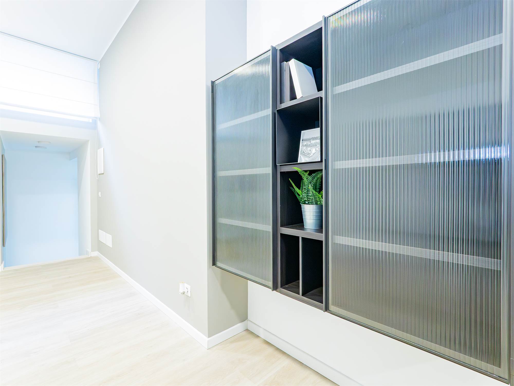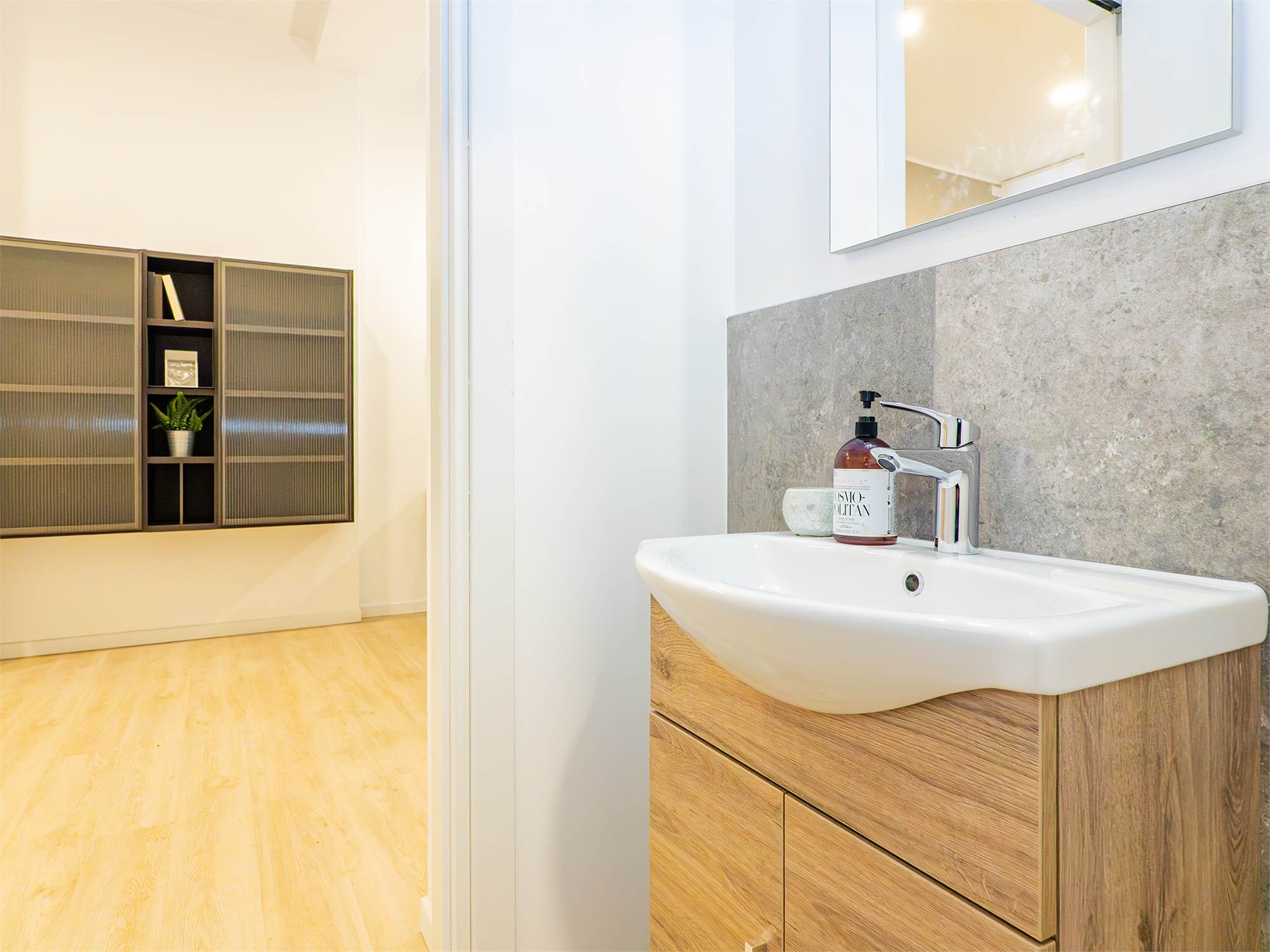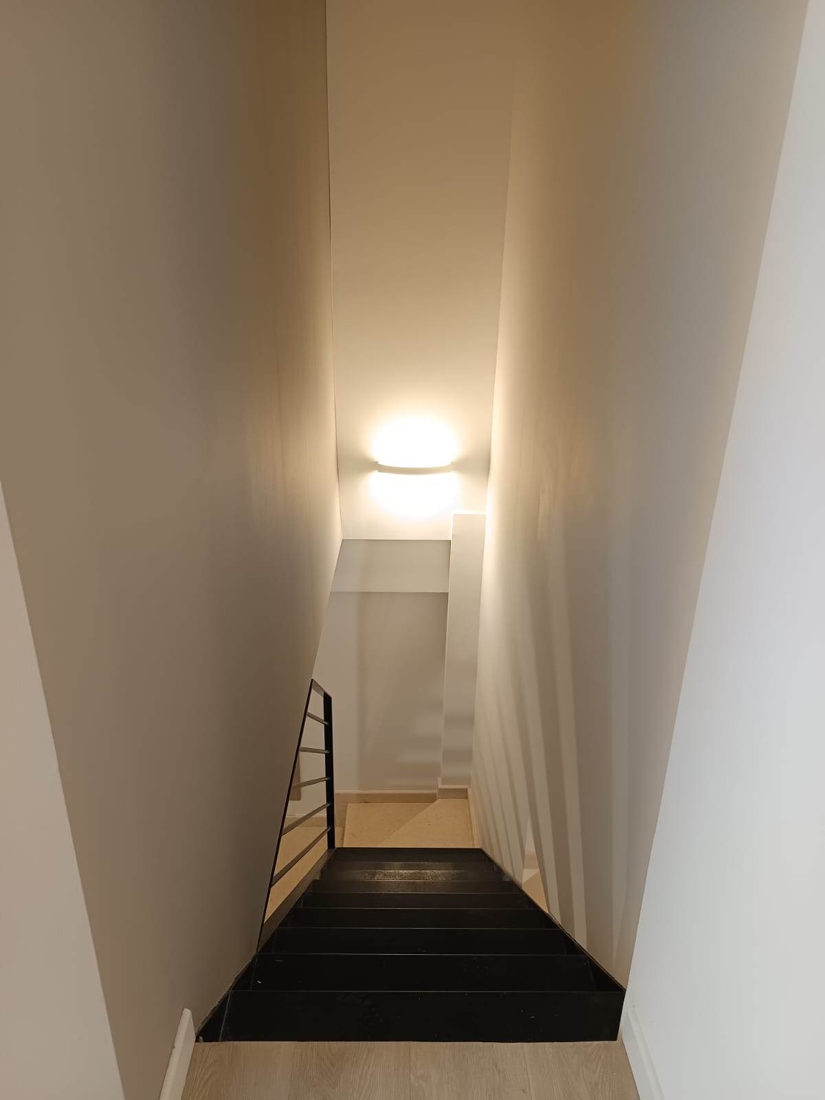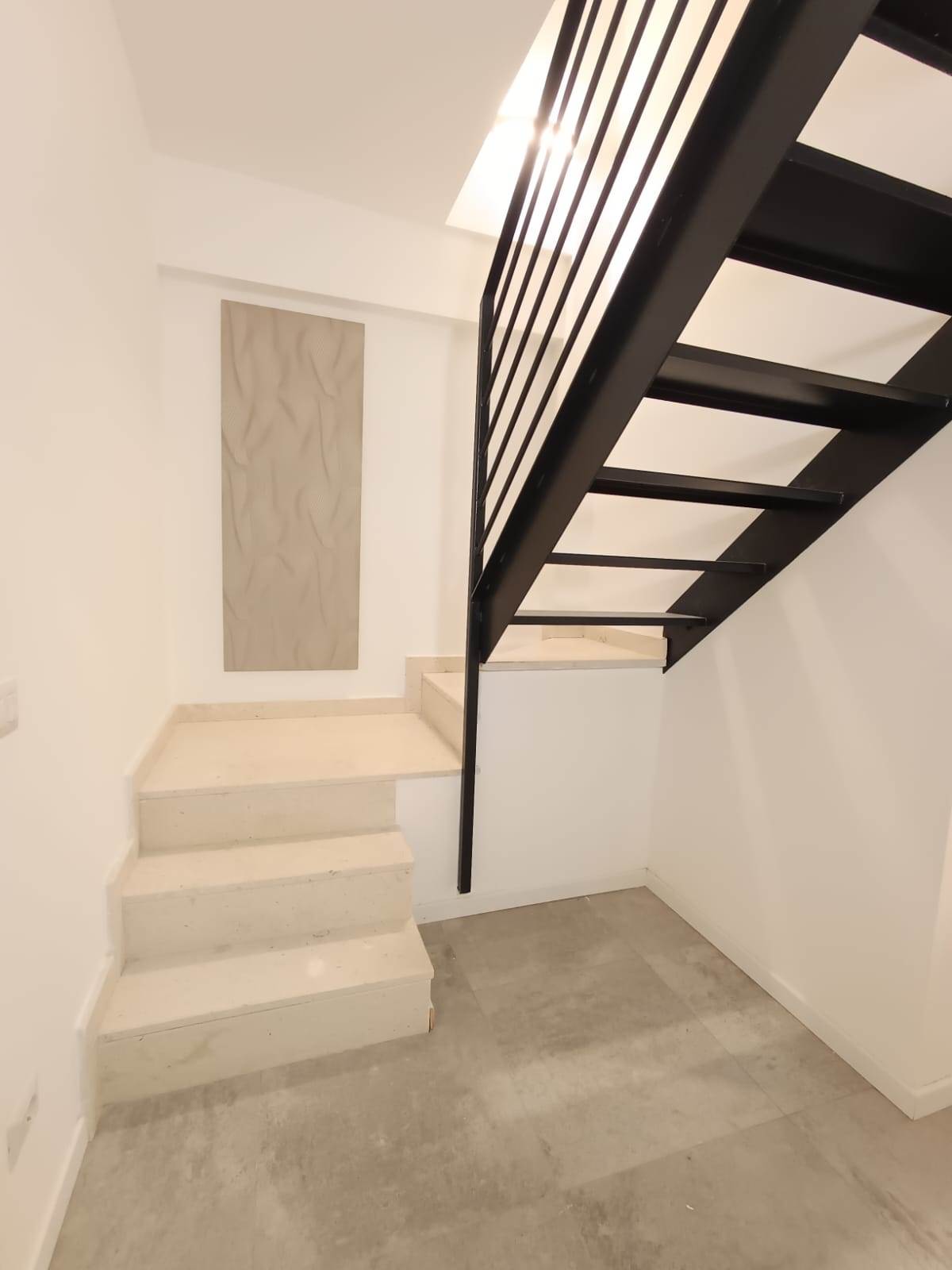 L’ingresso accompagna nella ampia e luminosa zona living con cucina a vista, bagno con doccia walk-in e camera da letto matrimoniale; la scala in ferro e muratura conduce al piano inferiore che si compone di un locale studio versatile con finestra in facciata, un secondo bagno completo con doccia e di una comoda zona funzionale adibita a lavanderia/stireria.