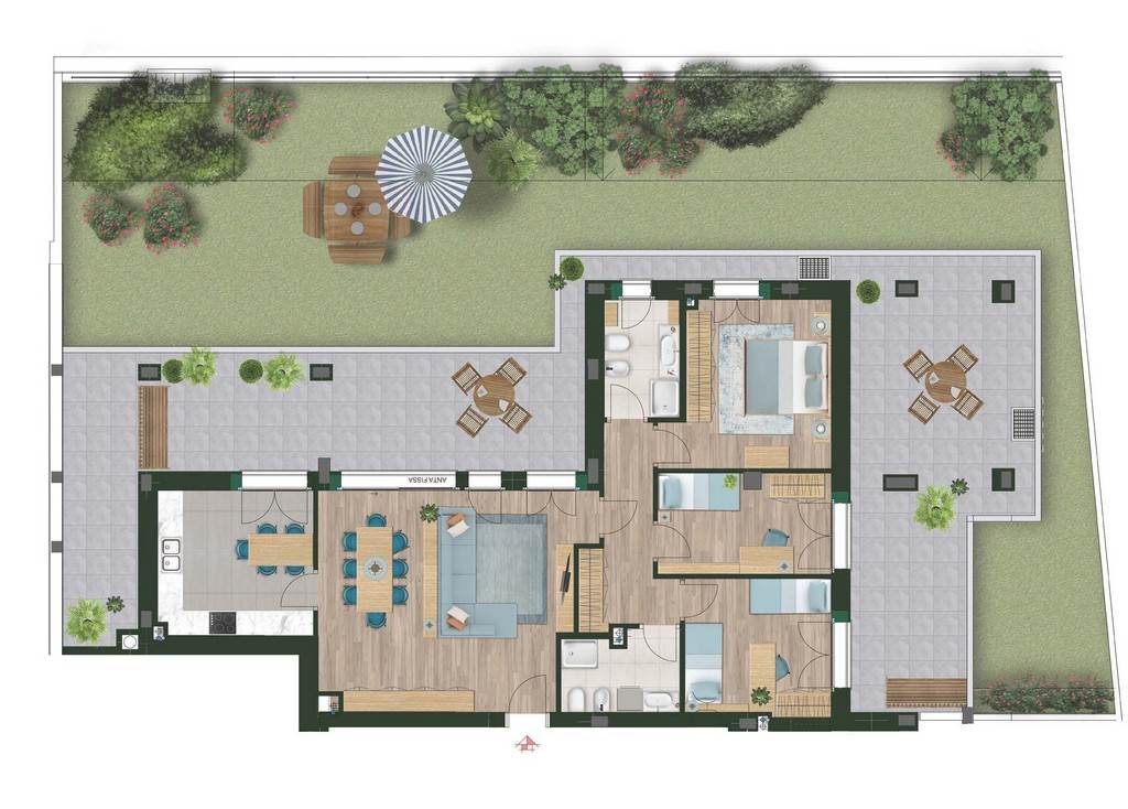 L’appartamento C1, di 4 LOCALI al piano terreno con giardino su tre lati, con esposizione SUD/EST, si compone di: